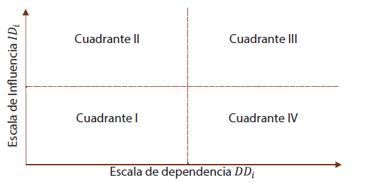 Por su parte, el algoritmo del software MicMac analiza la dispersión de las interacciones en el sistema, lo que permite clasificar las variables en cuatro grupos de acuerdo con los valores de IDi y DDi en una figura, tal como la que se muestra a continuación: