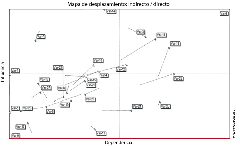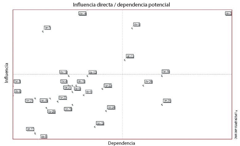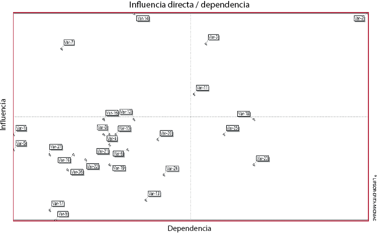 La clasificación de variables con base en su nivel de dependencia e influencia en el largo plazo se presenta en la figura 4. Un breve análisis, permite observar que 13 de las 27 variables se concentran en el primer cuadrante. Como se mencionó anteriormente, estas variables se caracterizan por ser independientes del sistema, por lo que su comportamiento no depende de lo que suceda con las otras variables.