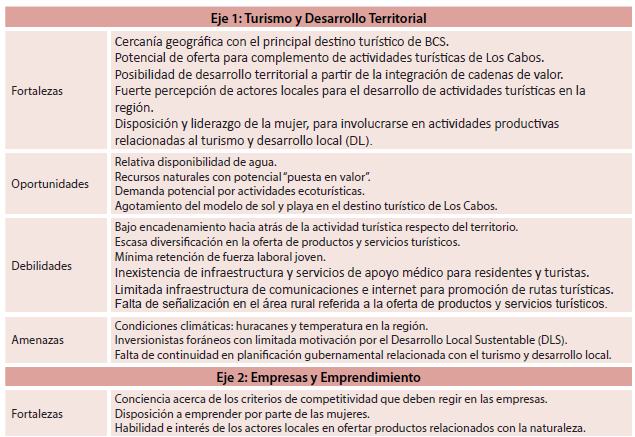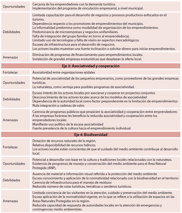 Los ejes propuestos fueron seleccionados en función de las características territoriales en lo económico, social y ambiental, mismos que fueron presentados, validados y reformulados (cuando el caso así lo requirió) a partir de la retroalimentación de los actores locales; de esta manera, las matrices resultantes fueron: