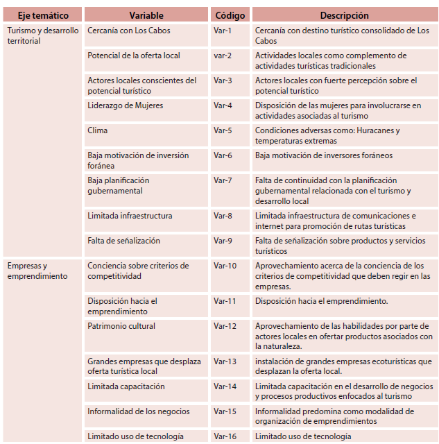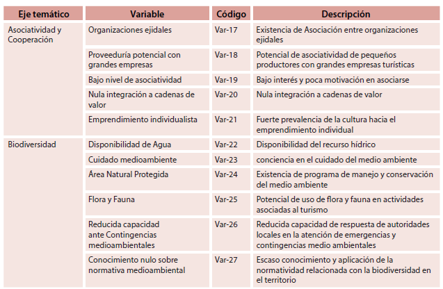 Una vez realizado el FODA, se procedió al análisis de reflexión colectiva. La implementación de este tipo de análisis, permitió reconocer las variables que reflejan un mayor peso en las matrices FODA, lo que dio como resultado la tabla 2, el cual contiene 27 variables representativas de la región, mismas que resaltan las principales variables para cada uno de los cuatro ejes temáticos. En la elaboración del análisis estructural participaron 11 expertos en los diversos temas, entre los que se incluyen académicos, biólogos y emprendedores de la región.