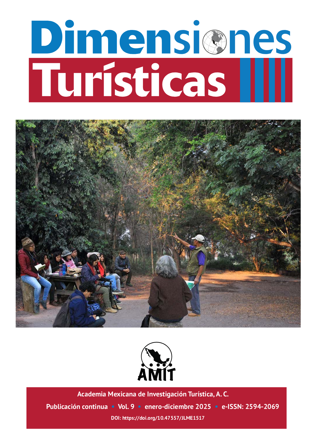Dimensiones Turísticas, es una revista de publicación continua, editada por la Academia Mexicana de Investigación Turística, Villa Costa Azul núm. 55, Mediterráneo Club Residencial, Mazatlán, Sinaloa, C. P. 82113, tel.: +52 (664) 631 63 00 ext. 1306, https://dimensionesturisticas.mx, dimentur@amiturismo.org. Editora responsable: Nora Leticia Bringas Rábago. Reserva de Derechos al Uso Exclusivo: 04-2018-082217054200-203, e-ISSN: 2594-2069, ambos otorgados por el Instituto Nacional de Derechos de Autor. Responsable de la última actualización de este número, administrador web de la Academia Mexicana de Investigación Turística: Carlos Vladimir Ruelas González, Carretera Escénica Tijuana-Ensenada Km 18.5, San Antonio del Mar, Tijuana, Baja California, C. P. 22560, fecha de última modificación: julio 2025.