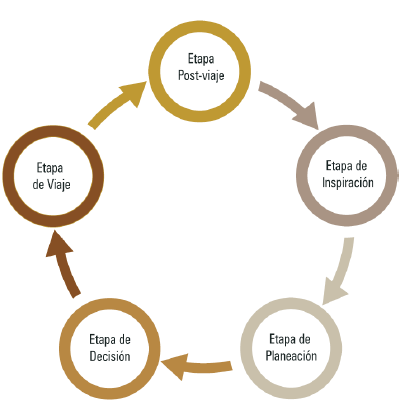 Como se puede apreciar en la figura 1, el proceso de decisión de viaje consiste en seis etapas claramente distinguibles: inspiración, planeación, comparación, compra, viaje y aquella después del viaje. De acuerdo con la literatura especializada, las OOV pueden tener influencia dentro de las decisiones de los viajeros a lo largo de las primeras cinco etapas, y en la última, como medio de expresión y comunicación con otros posibles interesados.