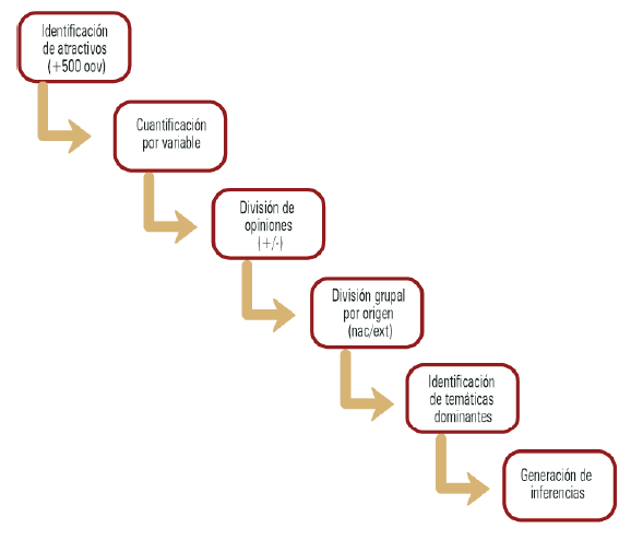 El proceso de análisis consistió en: 1) cuantificación por variable; 2) división de opiniones positivas y negativas; 3) división de grupos de opiniones nacionales y extranjeras; 4) identificación de temáticas dominantes por grupo de origen; 5) generación de inferencias; y 6) identificación de principales resultados y generación de conclusiones. Como referencia de este tipo de estudios, se revisó el de De Ascaniis y Cantoni (2017). En esta investigación se identifican y clasifican las temáticas de las OOV aplicando un procedimiento iterativo para la definición de categorías hasta llegar a una saturación. En la figura 2 se explica de manera gráfica el procedimiento de análisis.