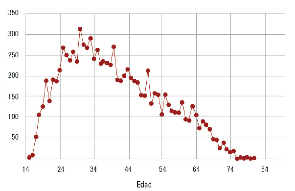 Por otro lado, en la figura 4 se puede apreciar la distribución de la participación de las opiniones por edad. Así, el grupo mayoritario de autores se concentra en el rango de los 20 a los 55 años. El promedio de edad global es de 40.11 años, la mediana de 38 años, y la edad mínima de 15 años, en tanto que la máxima reportada fue de 81 años.