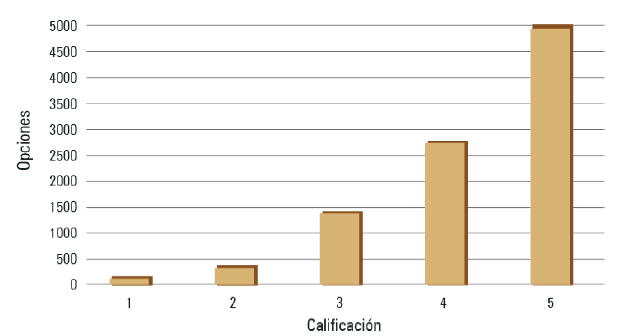 La figura 5 muestra la distribución global de las evaluaciones obtenidas en los diez atractivos analizados. Como se puede observar, la mayor parte de las evaluaciones de la experiencia en el atractivo se concentra en Bueno (4) y Muy bueno (5). Por ende, se puede explicar que la media se sitúa en 4.253 y la mediana en 4. Aun así, no se puede ignorar el hecho de que aproximadamente 19 % de las opiniones se ubica en un espectro de evaluación negativo (se consideran todas las evaluaciones que están en el rango 1-3).