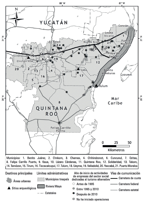 Para recabar la información primaria se aplicó un cuestionario de tipo censal integrado por 162 preguntas, del que se obtuvo información –de carácter social, cultural, ambiental y económico– de las 153 empresas turísticas en la Península de Yucatán que operan bajo una lógica de funcionamiento colectivo en escenarios comunitarios. Este mismo cuestionario fue aplicado durante el trabajo de campo realizado entre 2012 y 2016, y se hicieron los análisis correspondientes en el marco de una tesis de doctorado en geografía titulada Mayas de ayer y hoy: el papel de las sociedades locales en el desarrollo turístico de los espacios rurales (Jouault, 2018). Las respuestas a los cuestionarios con cuatro años de intervalo, así como la evolución de la región entre 2012 y 2016, permitieron analizar la relación entre las sociedades locales y la operación de las actividades turísticas en una región denominada traspaís de Cancún-Riviera Maya, a través de las empresas sociales que se dedican al turismo alternativo. Empleamos el sincretismo metodológico, una aproximación tanto cuantitativa como cualitativa, basada en una escala temporal de seis años –entre 2012 y 2018–, que incluyó: revisión bibliográfica en torno a entradas tales como turismo alternativo y región turística; censo de empresas sociales a través de encuestas aplicadas entre 2012 y 2016 en la región del traspaís Cancún-Riviera Maya; elaboración de mapas temáticos a partir de bases de datos organizadas y de sistemas de información geográfica; etnografía, incluyendo observación participativa, realizadas durante una estancia de nueve meses en dos pueblos maya-hablantes. El primero de ellos, Ek Balam, de construcción reciente y cercano al sitio arqueológico homónimo; el segundo, Yokdzonot, ubicado a diez kilómetros de Chichen Itzá.