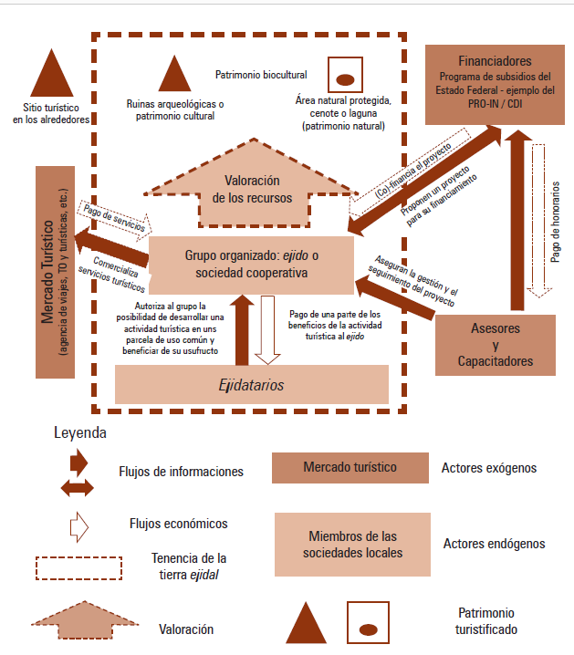 La escala regional es una herramienta pertinente de análisis permitiéndonos poner en perspectiva los diferentes casos de estudio teniendo en común un contexto histórico, socioeconómico, biogeográfico y cultural en común. El modelo de turistificación es el resultado de una sistematización diacrónica de las experiencias de turismo alternativo en esta región turística particular. Veinte años después de la creación de las primeras empresas sociales dedicadas al turismo alternativo, impulsadas por programas gubernamentales, el triángulo virtuoso de la turistificación en dicha región del traspáis Cancún-Riviera Maya y otras regiones mexicanas, así como en varios proyectos productivos en el campo mexicano, está basado en la relación tripartita de ejidatarios/consultores-asesores/programas institucionales y subsidiados.
