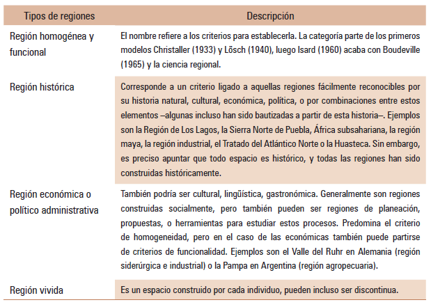 Si bien el concepto de región es fundamental en la geografía, es una noción difícil de aprehender, por una parte, porque a lo largo de la historia se ha empleado con diversas acepciones. Por otra, porque implica entender el territorio de una manera sintética, es decir, implica abstraer elementos clave que permiten diferenciar un territorio de otro a pesar de sus continuidades. Tanto una región construida socialmente, como el recorte de un espacio con una finalidad específica, se establecen a partir de alguno de los dos criterios anteriores: homogeneidad (áreas definidas por la similitud de algún elemento) o funcionalidad (definida por los flujos que se realizan en su interior). En este contexto, quedan englobados los cuatro tipos de regiones propuestos por Lévy y Lussault (2003), tal como lo muestra el cuadro 1.