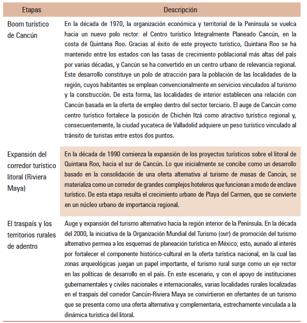 La región turística del traspaís de Cancún-Riviera Maya se inscribe en el desarrollo regional de la Península de Yucatán y sus diferentes etapas: la creación de Cancún en el principio de los años setenta y la consolidación del destino en los ochenta; la expansión del corredor turístico de la Riviera Maya hacia el sur; y por fin, la turistificación del territorio hacia el interior (cuadro 2).