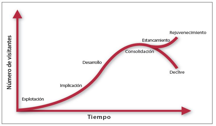 Basándose en el Ciclo de Vida de los Productos, Butler (1980) plantea que el Ciclo de Vida del Área Turística (CVAT) va desde una fase inicial a la que él denomina “exploración”, seguida por otras tres fases: desarrollo, consolidación y estancamiento. En este estancamiento pueden aparecer dos opciones: declive o rejuvenecimiento.