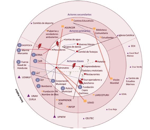 Los actores secundarios representan un total de quince (15) participantes, integrados desde el quehacer público por tres actores veto: Marina Mercante, Dirección General de Pesca y Agricultura (DIGEPESCA), y Fuerza Naval de Honduras; además, se cuenta con la Unidad de Desarrollo Integral de la Mujer y la Familia (UDIMUF) y el apoyo de la Universidad Nacional Autónoma de Honduras (UNAH-CURLA) y la Universidad Pedagógica Nacional Francisco Morazán (UPNFM-CURCEI). Del sector privado se refleja la vinculación del Centro Universitario Tecnológico (CEUTEC), Cruz Roja Hondureña, Cruz Verde, GOAL Honduras, el Centro de Estudios Marinos y la Empresa Energía de Honduras. Los actores civiles y religiosos se representan por la Iglesia Católica y el Comité de Deportes.