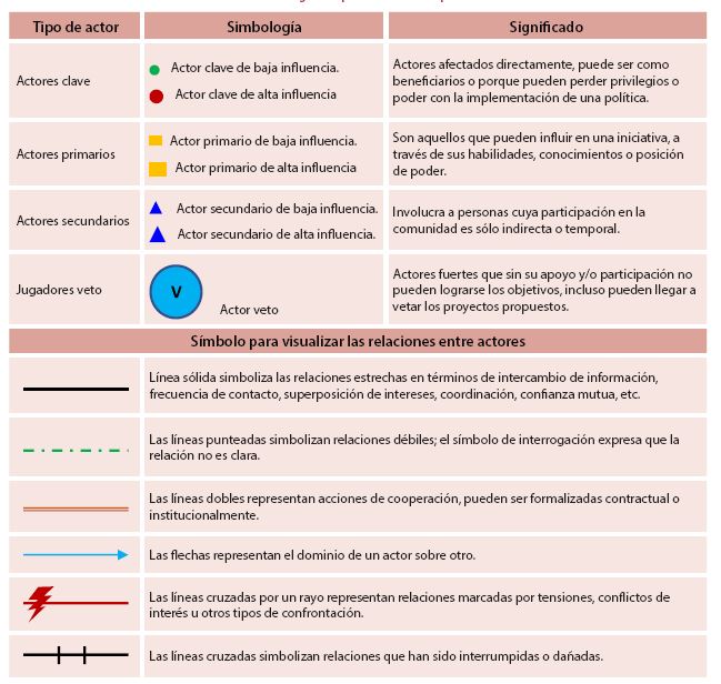 Para la identificación de los procesos de asociatividad existentes en ambas comunidades, se realizó un taller investigativo de forma integradora y participativa (Sandoval, 2002), el cual se sustentó en una adaptación del taller “Mapa de actores del proyecto”, propuesto por la consultora C40 Cities Finance Facility (2017). Haciendo uso de esta técnica, se identificaron los actores bajo la denominación técnica de: actores clave, actores primarios, actores secundarios y jugadores veto, valorados por el grado de participación en baja y alta influencia; cada actor y sus relaciones fueron expresadas en un mapa de actores, basada en la siguiente simbología: