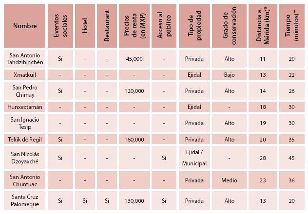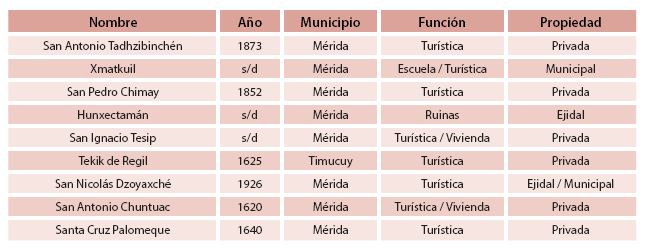 Por otro lado, las de menor visibilidad son Xmatkuil y Hunxectamán. La primera porque el espacio arquitectónico ha sido habilitado para albergar un centro educativo; en la segunda, son casi nulos los relictos de su existencia, salvo los recuerdos que tienen de ella los pobladores de la comunidad. A excepción de Hunxectamán, la mayoría de las haciendas cuentan con un buen grado de conservación, ya sea en los cascos principales, jardines o infraestructura. Lo que ha inducido a sus propietarios a la búsqueda de diversificar sus actividades, productos y servicios, ya sean de índole natural, cultural o negocios (figura 3 y tabla 2).