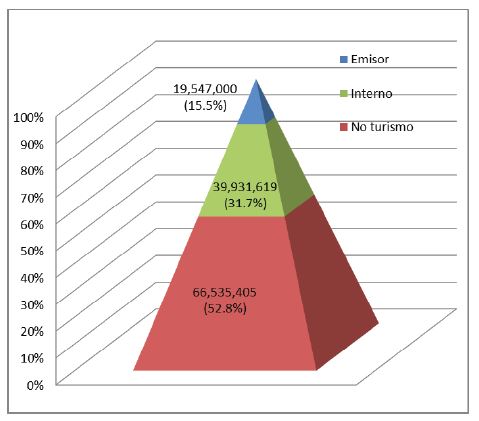 La punta de la pirámide agrupa a un 15.5% de la población, esto es, las 19’547,000 personas que acceden a hacer tanto turismo interno como emisor (estimándose que cada viaje internacional sea realizado por una persona). En la base de la pirámide quedaría un 52.6% de la población, 66’535,405 personas que están en la pobreza y, por lo tanto, como ya se argumentó anteriormente, sin ingresos para cubrir sus necesidades básicas, pues aún no tienen la condición básica para hacer un consumo significativo de productos y servicios turísticos. Por lo tanto, ante la diferencia entre ambos, se puede estimar que en la parte media se agruparía el 31.7% de la población, unas 39’931,619 personas, que sería quienes constituyen el mercado de turismo interno.