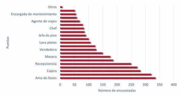 Actualmente, 52% de las encuestadas concentra sus ocupaciones en puestos como el de recepcionista, cajera, recamarista y mesera en los hoteles en los que se emplean. Al caracterizar dichos puestos, las empleadas afirman que son labores donde es necesaria la actitud de servicio, calidez, amabilidad, sutileza y empatía; desde la perspectiva de los estereotipos de género, son atributos de la expresividad (Fiske y Stevens, 1993) considerados como comportamientos “naturales” de las mujeres. Aunque para Roldan (2000, p. 89) también “las mujeres naturalmente poseen una alta habilidad manual, son dóciles y disciplinadas y cuentan con la personalidad más adecuada para realizar los trabajos más tediosos, repetidos y monótonos”. De igual forma, es posible identificar los puestos que son menos ocupados por mujeres, tales como agente de viajes (13%), proveedora (12%) y barman (11%), a dichos puestos se les atribuye generalmente características masculinas, además de que algunos de estos son considerados peligrosos porque son desempeñados durante la noche.