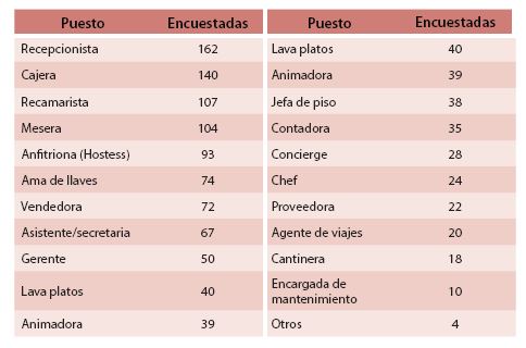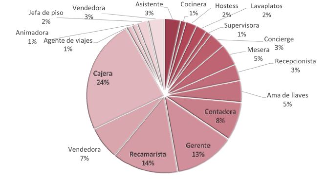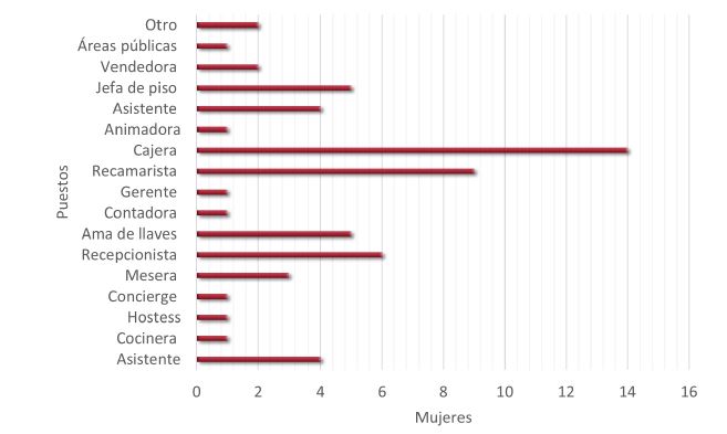 De acuerdo con los resultados obtenidos, los puestos ocupados por ellas están relacionados con tareas que de manera “natural” pueden realizar; de esta forma, se observa que han sido encasilladas en puestos en que reproducen los roles y estereotipos de género; particularmente, realizan labores relacionadas con la limpieza (de áreas públicas del hotel, habitaciones, pasillos), con la atención de personas (servicio al huésped, recepción) y organización de insumos (hostess, ama de llaves).