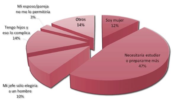 Los roles de género no sólo encasillan a las mujeres en puestos considerados de “naturaleza” femenina, sino que al considerarse trabajos “fáciles” de hacer son altamente infravalorados, sin dejar de mencionar que reproducen diversas formas de desigualdad entre hombres y mujeres. De acuerdo con los resultados, sólo 51% de las mujeres encuestadas ocupa puestos directivos de alto rango; como gerente (10%), jefa de piso (13%) y ama de llaves (28%), considerando que este último está relacionado con el trabajo doméstico. Para las mujeres esto representa falta de oportunidades de desarrollo profesional y escasa posibilidad de movilidad vertical en la estructura ocupacional de estas empresas turísticas. En la Figura 7 se muestran algunos obstáculos que observan las mujeres para poder acceder a otros puestos de trabajo, 47% de las encuestadas considera que necesitaría estudiar o prepararse más para ocupar alguna otra posición en las empresas para las cuales laboran actualmente.