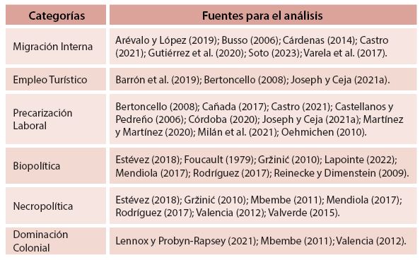 Tabla 4. Categorías y fuentes para el análisis