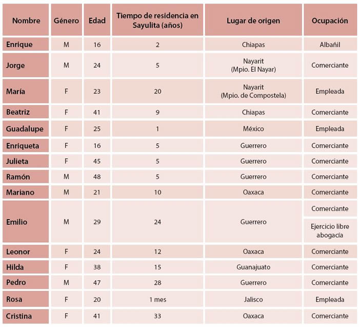 En las 15 entrevistas cualitativas semiestructuradas realizadas a 6 hombres y 9 mujeres en la localidad, se recogieron datos sociodemográficos de las personas entrevistadas (ver tabla 5) quienes refirieron que en su lugar de origen se dedicaban a la siembra de la tierra, la albañilería, la elaboración y venta de artesanías, pero también como empleados; no obstante, los ingresos que obtenían por su trabajo eran insuficientes para la satisfacción de las necesidades personales y de su familia. Las redes con familiares y amigos que laboran en Sayulita les facilitaron tomar la decisión de desplazarse al destino, su establecimiento en el lugar y la obtención de un empleo. Pese a lo anterior, manifestaron algunos de ellos, que aun con el apoyo de redes fue difícil el desplazamiento e incluso la estancia, porque les brindaron ayuda al llegar, pero la relación en algunos casos, no se ha mantenido.