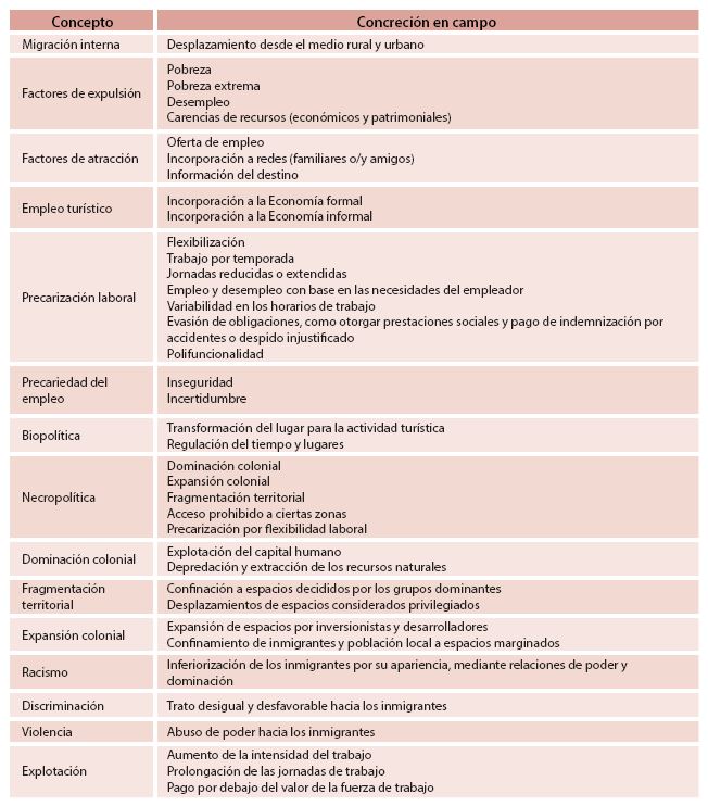 Tabla 6. Relación de conceptos y su concreción en campo