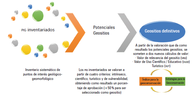 Se eligió la metodología de Walter Medina Importancia de la geodiversidad. Método para el inventario y valoración del patrimonio geológico, publicada en 2015. En una primera etapa, los geositios inventariados y seleccionados se sometieron a una serie de criterios asignándoles valores de acuerdo con sus características intrínsecas; este hecho parte de la idea básica de que no es posible conservar todo lo que se ha inventariado, lo que obliga a una revisión y evaluación exhaustivas que lleven a seleccionar los lugares más representativos de la geodiversidad, consiguiendo de este modo explicar mejor la evolución geológica del área de estudio. La segunda etapa corresponde al porcentaje de aprobación (pa), para lo cual la suma del puntaje otorgado a cada parámetro de valoración (escala de valoración individual) debería alcanzar un mínimo de 44 puntos, lo que corresponde a 50 % de aprobación; los lugares que obtuvieron este porcentaje fueron considerados como geositio y, en etapas posteriores, alimentarán una propuesta de geoconservación.