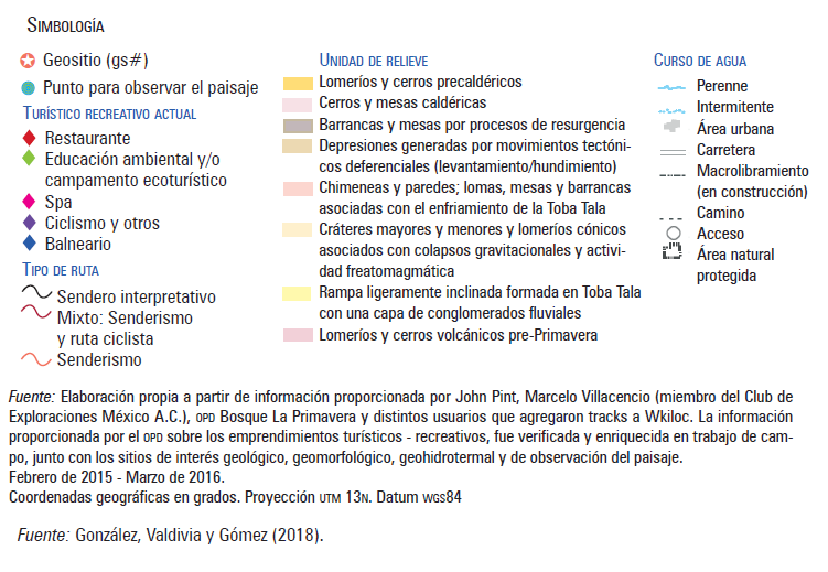 Las contribuciones de este estudio se orientan a otorgar un inventario y localización de los elementos que fueron valorados como patrimonio geológico-geomorfológico, puntos de observación del paisaje volcánico y su relación con otras actividades de naturaleza turístico-recreativas, entre las que se encuentran senderos, rutas ciclistas y el equipamiento tradicional que basa su oferta en recursos geohidrotermales (balnearios), respecto al área natural protegida (ANP) sierra La Primavera, adyacente al Área Metropolitana de Guadalajara, Jalisco, México. Esta información se ha sistematizado y georreferenciado, abriendo la posibilidad de poner sobre la mesa las oportunidades para la práctica del geoturismo, un insumo para la gestión del ANP que no se ha destacado anteriormente.