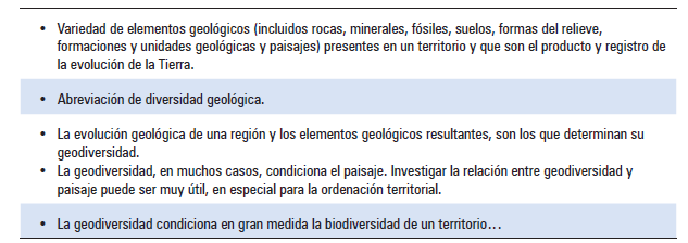 Cuadro 1. Distintos conceptos y componentes conceptuales de la Geodiversidad