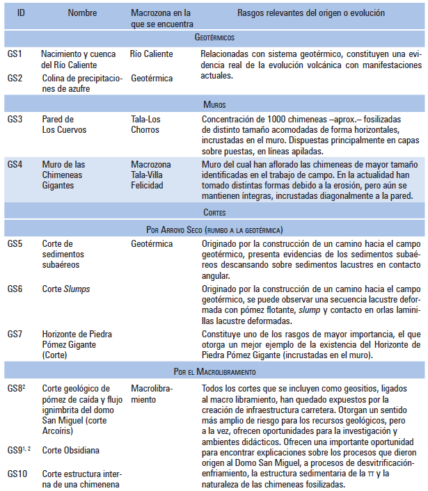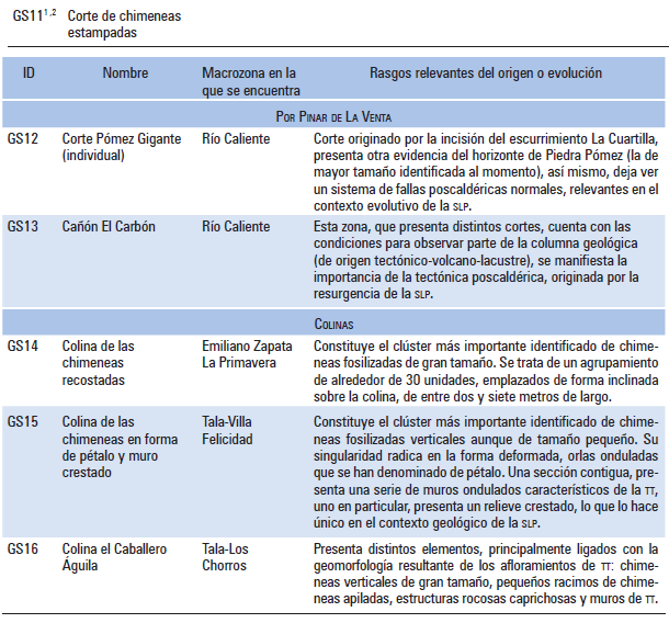 Cuadro 2. Lista de geositios (potenciales y reales) definidos en función de su valor para representar rasgos distintivos de la evolución geológica de la SLP
