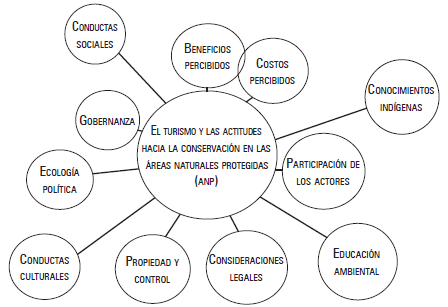 En el marco conceptual expuesto en la figura 1 se presenta una relación precisa de los factores que influyen en el turismo y las actitudes hacia la conservación en las ANP. Como se observa, las actividades turísticas en las ANP pueden generar dos tipos de actitudes hacia la conservación: positivas o negativas, dando lugar al éxito o al fracaso en su gestión.