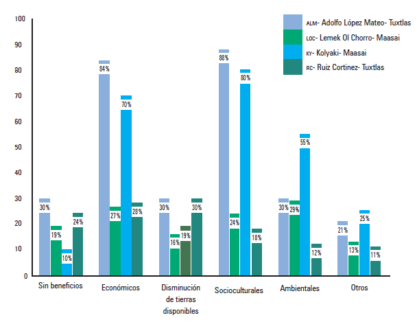 Con relación a los impactos generales del ecoturismo, la figura 3 ilustra claramente que el aumento de la actividad ecoturística ha originado diversos efectos negativos, sobre todo en las comunidades donde la actividad se realiza a una escala más amplia. Los encuestados de Lemek/Ol Chorro y Ruiz Cortines refieren menos impactos negativos (por ejemplo, consideran que su participación en el ecoturismo es mínima y no les permite generar beneficios), mientras los de Koiyaki y Adolfo López Mateos indican los diversos impactos negativos del ecoturismo: un aumento de los problemas ambientales como la contaminación, e impactos socioculturales como la pérdida de culturas indígenas y desintegración general de la comunidad (en el caso de Koiyaki).