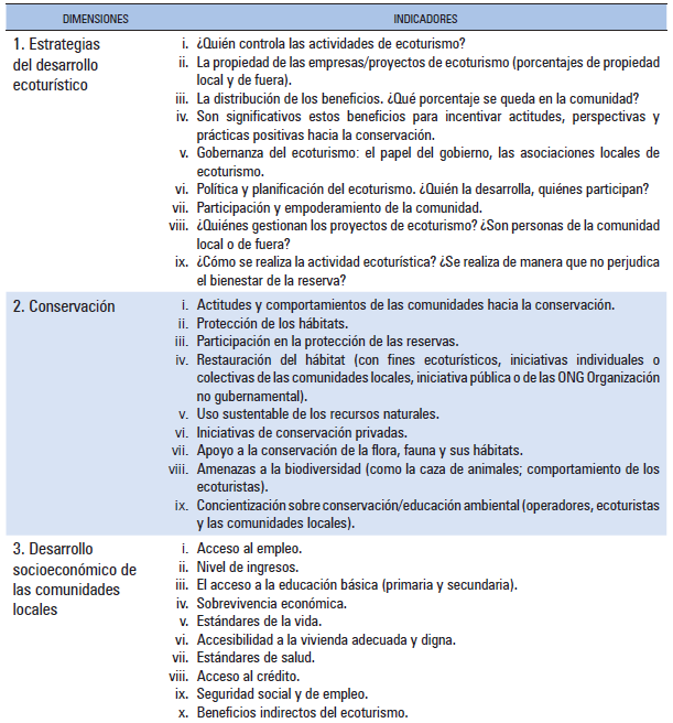 Ante esta situación, académicos y políticos están proponiendo investigaciones que mejoren la eficacia de las estrategias de conservación a través del desarrollo local (véase por ejemplo Honey, 2008; Eric et al., 2011; Brenner y Job, 2012; Vargas del Río y Brenner, 2013). Además, Guerrero Rodríguez (2010: 43) señala que es evidente “la falta de investigación acerca de las realidades existentes en los proyectos de ecoturismo”, por lo que sugiere indagar sobre las diferentes estrategias empleadas en la implementación del concepto y evaluar si los proyectos mantienen una orientación hacia la conservación de los recursos naturales y si consideran la sustentabilidad social y cultural en los espacios donde se desarrolla. El cuadro 1 resume las categorías analíticas (dimensiones e indicadores) del desarrollo ecoturístico sustentable en las ANP, que se han utilizado en diversas investigaciones en este campo para determinar criterios de evaluación (Honey, 2002; Picard, 2015; Weaver, 1998, 2006).