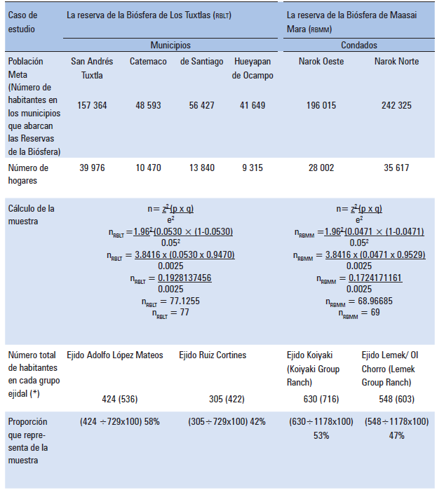En el caso de la RBLT, se tomó como población meta cuatro municipios que rodean la reserva: San Andrés Tuxtla: 157 364 habitantes y 39 976 hogares; Catemaco: 48 593 habitantes y 10 470 hogares; Santiago Tuxtla: 56 427 habitantes y 13 840 hogares; y Hueyapan de Ocampo: 41 649 habitantes y 9 315 hogares; el total es de 304 033 habitantes y 73 601 hogares (Instituto Nacional de Estadística y Geografía, 2010). En cuanto a Kenia, se consideraron dos condados como población meta: Narok Oeste, con 196 015 habitantes y 28 002 hogares, y Narok Norte, con 242 325 habitantes y 35 617 hogares, cuyo total es de 438 340 habitantes y 63 619 hogares.