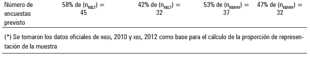 Del número total de hogares, se estima que solo 3 900 y 2 997 se encuentran contiguos a la RBLT y a la RBMM, respectivamente, y participan en actividades ecoturísticas. El tamaño de la muestra para la parte cuantitativa fue bastante grande (nRBLT=77 y nRBMM=69) (véase cuadro 3). Este tamaño de muestra se calculó de acuerdo con la fórmula propuesta por Morse (2003), con una precisión de 5 %, y 95 % de nivel de confianza: