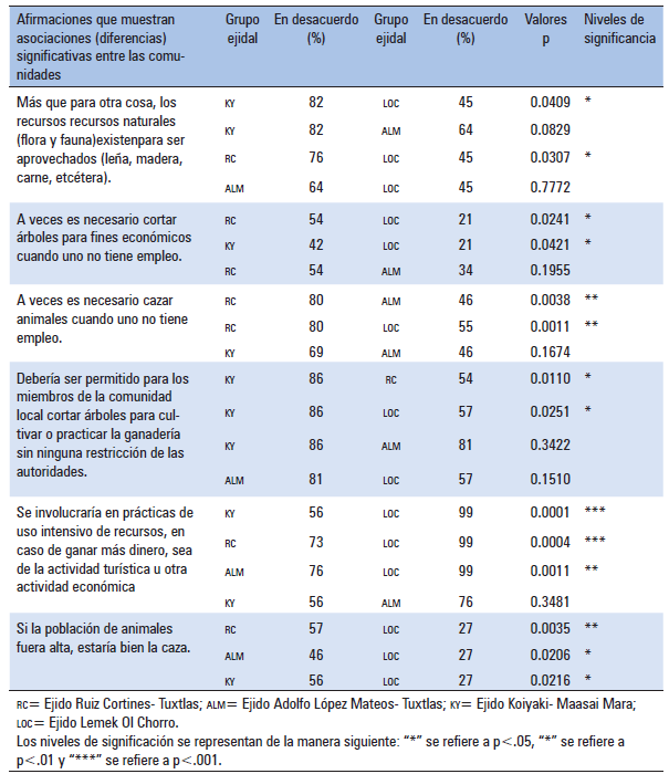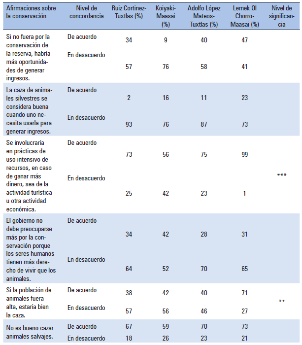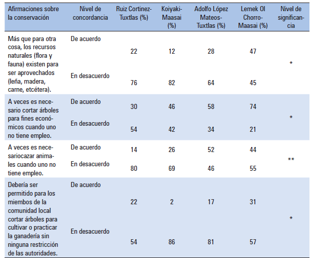 Uno de los principales hallazgos de los diferentes grupos ejidales es que los miembros de las comunidades consideran a la biodiversidad (flora y fauna) como parte importante de su sobrevivencia, por lo que reconocen la trascendencia de proteger los recursos naturales para las generaciones futuras. Sin embargo, ha sido difícil conciliar sus necesidades económicas con las de conservación. Respecto a los resultados del cuadro 4, se puede observar que miembros de la comunidad local en distintos grupos ejidales consideran ciertas prácticas como aceptables y otras no, dependiendo de la forma en que interpretan el concepto de conservación. El cuadro muestra una comparación de las actitudes hacia la conservación entre las cuatro comunidades, notándose que hay seis casos en los cuales las comunidades difieren de manera significativa en lo referente a las prácticas hacia la conservación. En general, los encuestados cuyas comunidades presentan actividad ecoturística disminuida (especialmente Ruiz Cortines y Lemek/Ol Chorro) demostraron actitudes más negativas hacia la conservación, mientras que los de comunidades que experimentan mayor actividad ecoturística (Koiyaki y López Mateos) manifestaron actitudes más positivas (véase cuadro 4).