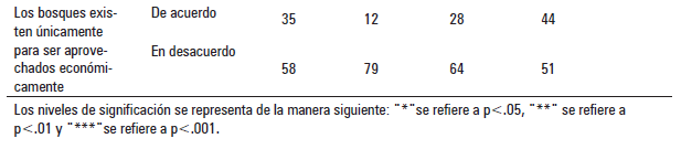 Se encontraron asociaciones en únicamente cinco de las 12 correlaciones realizadas (pruebas de Chi-cuadrado) entre empleo o participación y las actitudes hacia la conservación, y solo una de las cinco asociaciones fue estadísticamente significativa en p<.05 (los encuestados que cuentan con empleo en comercios ecoturísticos y los que no); la afirmación de conservación en donde difirieron fue: “debería ser permitido para los miembros de la comunidad local cortar árboles para cultivar o practicar la ganadería sin ninguna restricción de las autoridades”.