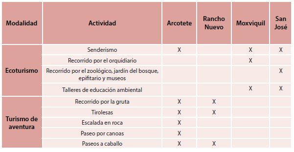 Durante los recorridos se observó que en Arcotete y Rancho Nuevo se permiten actividades como paseo a caballo, tirolesa y escalada en roca que no corresponden a la modalidad del ecoturismo sino al turismo de aventura (ver tabla 4).