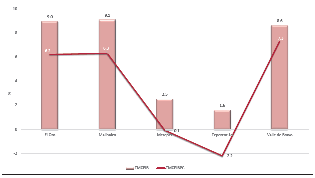 En ella se resalta que todos los PM mexiquenses vieron expandir su actividad económica en el período considerado. En la mayoría de ellos el ritmo de crecimiento es notable e indudablemente muy superior a sus referentes estatales y nacionales. Tasas medias anuales que fluctúan 8.6 y 9.1% sorprenden porque atestiguan el carácter expansivo de la producción e “insinúan” el carácter concomitante entre la categoría turística y otros factores impulsores del crecimiento. El ritmo anual de crecimiento ha sido tan grande que en esos municipios se ha traducido en aumentos relativos significativos en el PIB per cápita: un signo inequívoco de que, en promedio, el nivel de vida de los habitantes se ha elevado de forma sensible: alrededor del 6%.