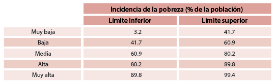 Para probar la existencia o ausencia de esa concomitancia, se procede en dos etapas: en la primera se clasifica a los PM en distintos estratos de incidencia de la pobreza. El método utilizado es Dalenius-Hodge, que permite establecer los rangos para cada estrato (Instituto Nacional de Estadística y Geografía, INEGI, 2010). El resultado de este ejercicio arrojó los siguientes estratos de incidencia de la pobreza (ver tabla 1):