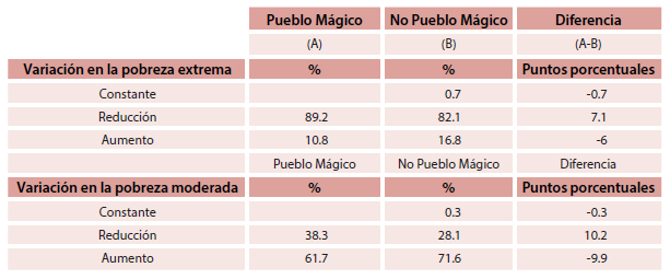 En ambos grupos la mayoría de los municipios se agrupa en el segmento en el que se ha reducido la pobreza; sin embargo, el conglomerado de PM concentra un número relativo más grande de disminución de la pobreza que el conjunto de contraste. La diferencia es de 16 puntos porcentuales; lo cual “insinúa” que “podría” haber cierta influencia de la política turística en el resultado.
