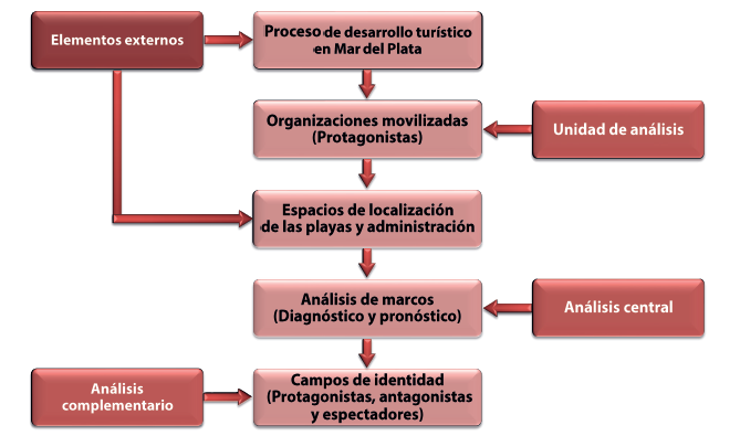 Se incorporan al trabajo otras cuestiones que exceden el análisis de marcos, como elementos que permiten comprender mejor el enfoque adoptado y contextualizar el análisis central. En un primer punto, se hace referencia al desarrollo turístico en la ciudad, con la identificación de las etapas y distintas circunstancias que incidieron en la emergencia del conflicto. Enseguida, se describen las organizaciones que protagonizan el proceso de movilización (unidades de análisis), y se indican las distintas administraciones de los bienes en pugna. En la figura 2 se observa el contenido y los apartados correspondientes.
