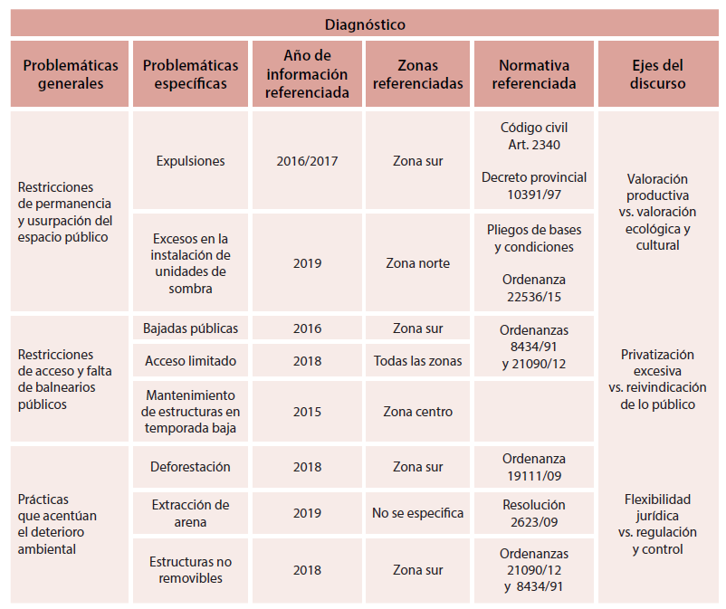 Al revisar las demandas de los movilizados, se observó la existencia de tres cuestiones fundamentales que dan cuenta de lo establecido: a) las restricciones de permanencia y la usurpación del espacio público, b) las limitaciones de acceso y la falta de balnearios públicos, y c) el desarrollo de prácticas que acentúan el deterioro ambiental.