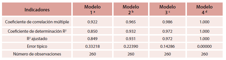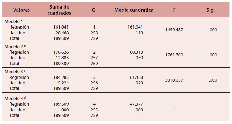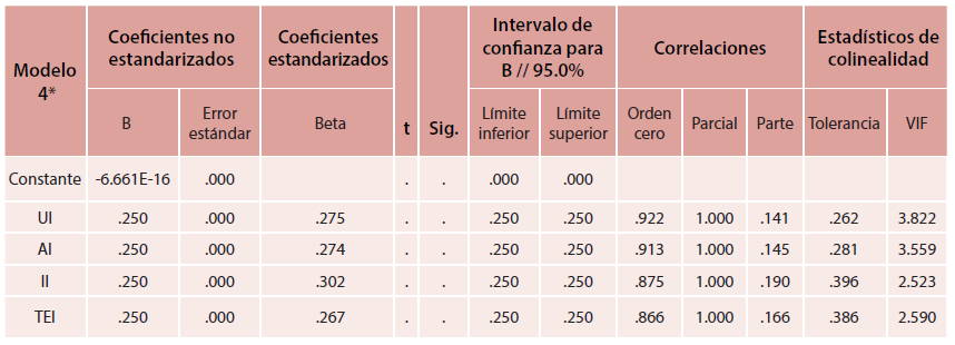 Se muestran los valores obtenidos para cada uno de los modelos regresión; el ajuste del modelo final es perfecto, lo que indica que todas las variables en conjunto representan a la EC de manera cabal. Sin embargo, trasciende que el modelo 1, representado únicamente por el UI destaque con un valor de R2 ajustado igual al 84.9% (tabla 1), lo que se traduce en que únicamente esa variable representa en tal proporción a la EC. Dichos valores, de acuerdo con Cohen et al. (2003), se consideran efectos de gran tamaño. Esto demuestra que existe una derivación efectiva de regresión altamente significativa entre las variables UI, AI, II, TEI y la EC. Ello tiene especial importancia al observar el análisis de la varianza de cada uno de los modelos de regresión (ver tabla 2).