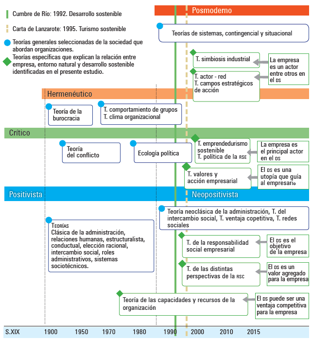 A manera de síntesis de este cuarto apartado, puede afirmarse que el estudio de la relación entre empresa turística y desarrollo sostenible se enmarca teóricamente en tres perspectivas principales y varias minoritarias, que encuentran fundamento en las teorías generales de la administración y las teorías generales de la sociedad, que a su vez toman sentido desde cierto paradigma del conocimiento científico, lo cual puede observarse en la línea de tiempo de la figura 2.
