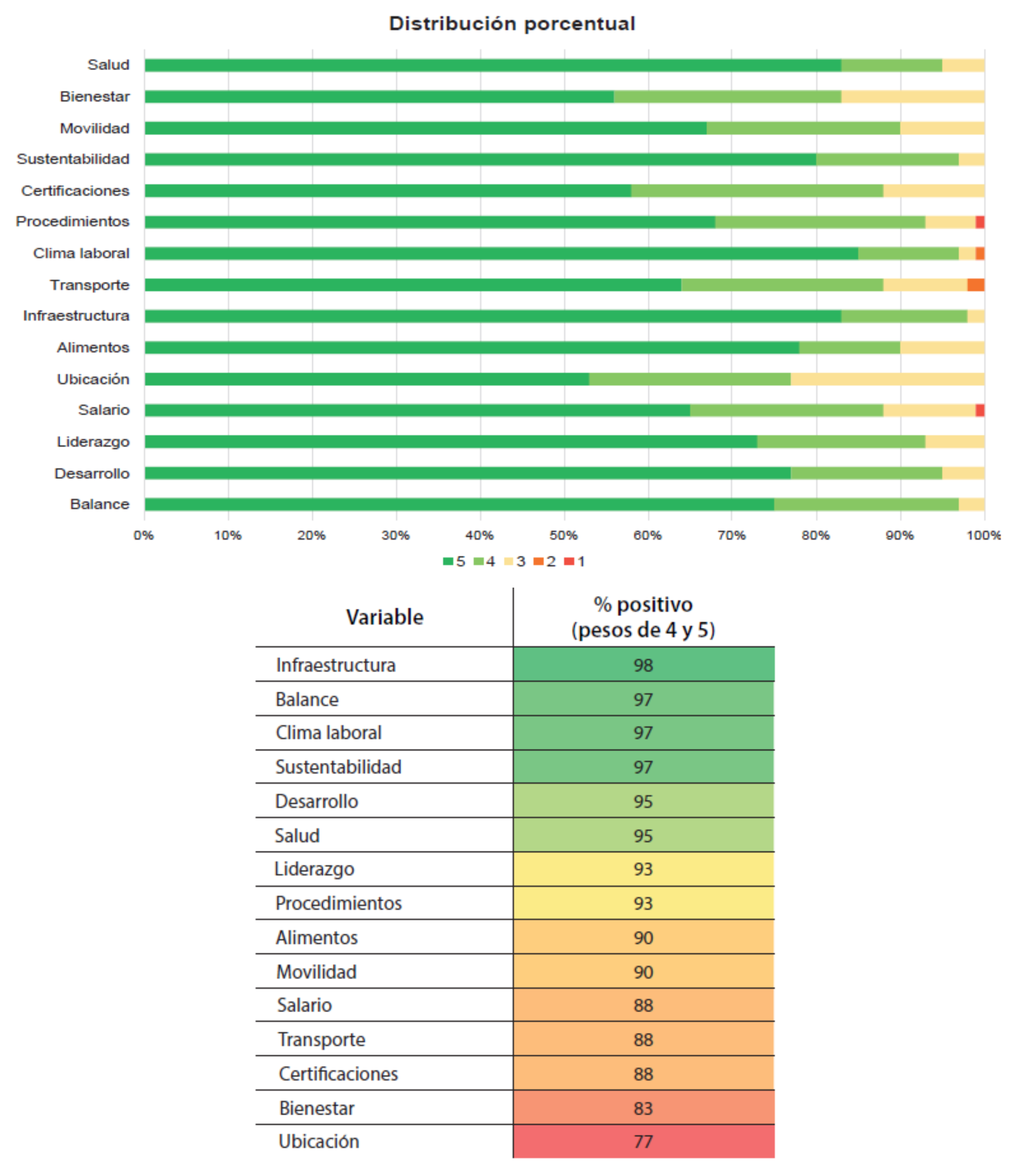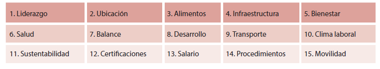 En el semáforo que se muestra abajo de la figura 1, se enlista la totalidad de las variables de expectativas laborales. De acuerdo con la intensidad del color, el verde fue el mejor ponderado (se sumaron los puntos 4 y 5, que expresaban acuerdo con el ítem descrito), y el rojo el menor calificado. Destaca que 23 de los 100 encuestados dijeron no estar interesados en la localización de la empresa que seleccionarán para trabajar, pues evaluaron ese punto como neutral (3 puntos en escala de Likert).