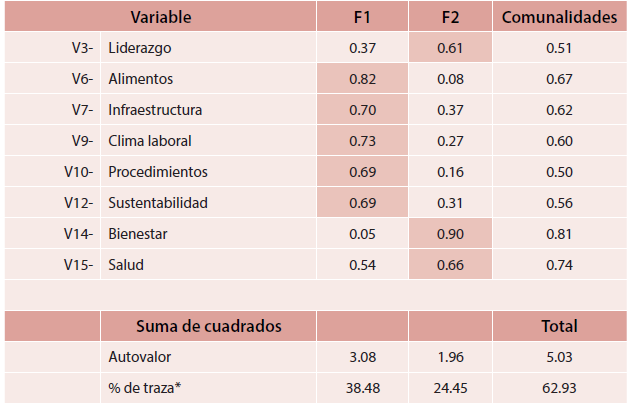 Por tanto, el F1 se compondrá de las variables alimentos (V6), infraestructura (V7), clima laboral (V9), procedimientos (V10) y sustentabilidad (V12); y el F2, por liderazgo (V3), bienestar (V14) y salud (V15). Con ello, al F1 se le puede denominar bloque A, y al F2 bloque B.