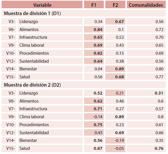 Hacia la validación del modelo, se fraccionó la base de datos con la mitad de los casos (n/2) componiendo la muestra de división 1 (D1) del registro 1 al 50, y la muestra de división 2 (D2) del 51 al 100. Los resultados se despliegan en la tabla 8. Al observar ambas, se percibe que las cargas entre factores se mantuvieron casi en la misma proporción, así como su varianza explicada; no sucedió así con variables como liderazgo (V3), bienestar (V14) y salud (V15), cuyos valores en la D1 fueron de 0.34, 0.04 y 0.56, respectivamente, y en la D2, se aprecian igual a 0.52, 0.56 y 0.87, esto es que marcan más carga hacia el F1 en la muestra D2, que en el F1 de la D1.