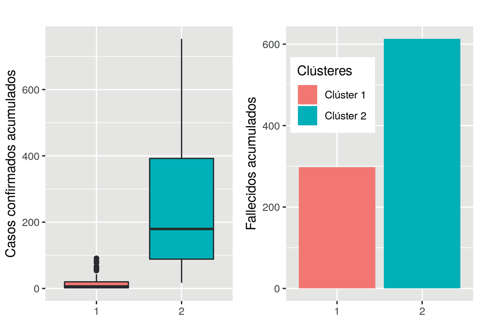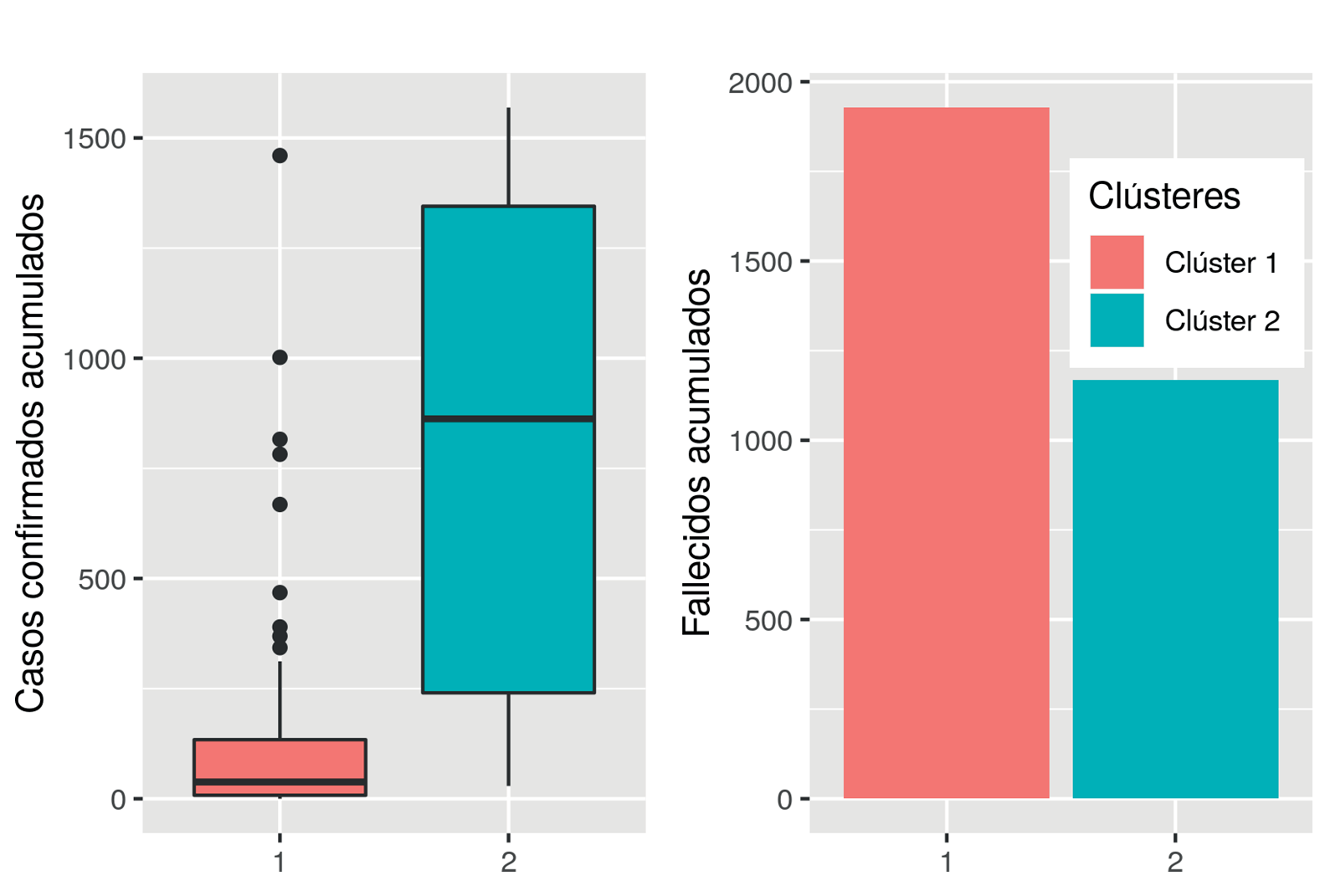 El segundo clúster tiene municipios con mayor número de habitantes y el mayor número de personas no afiliadas a los servicios de salud, la mayor parte de ellos cuentan con aeropuerto; en tanto que el clúster 1 agrupa a centros turísticos con mayor número de cuartos disponibles y también presentó el mayor número de casos confirmados acumulados, aunque el promedio es menor que para el segundo clúster, en el cual se encuentran todos los fronterizos y uno del interior.