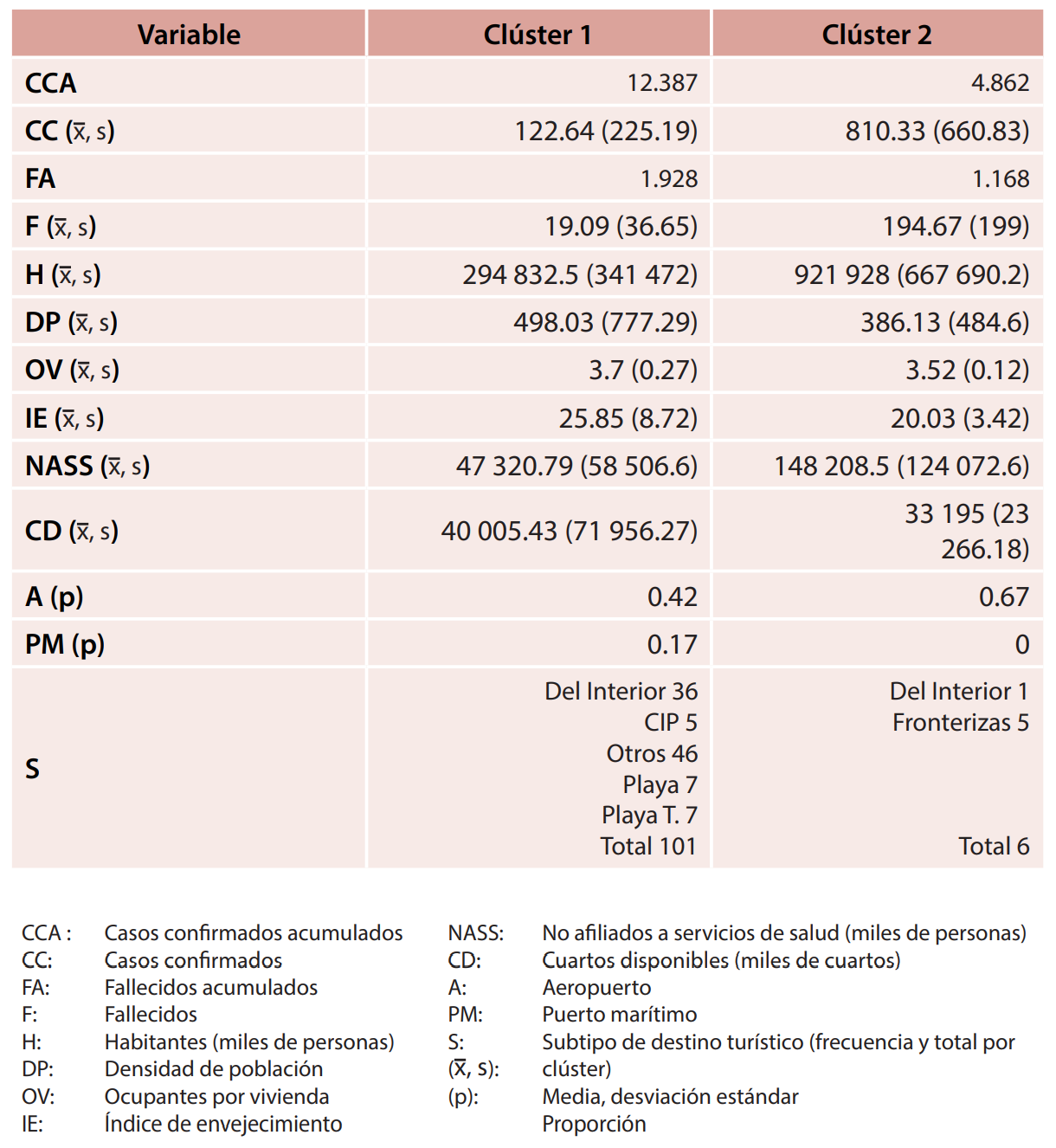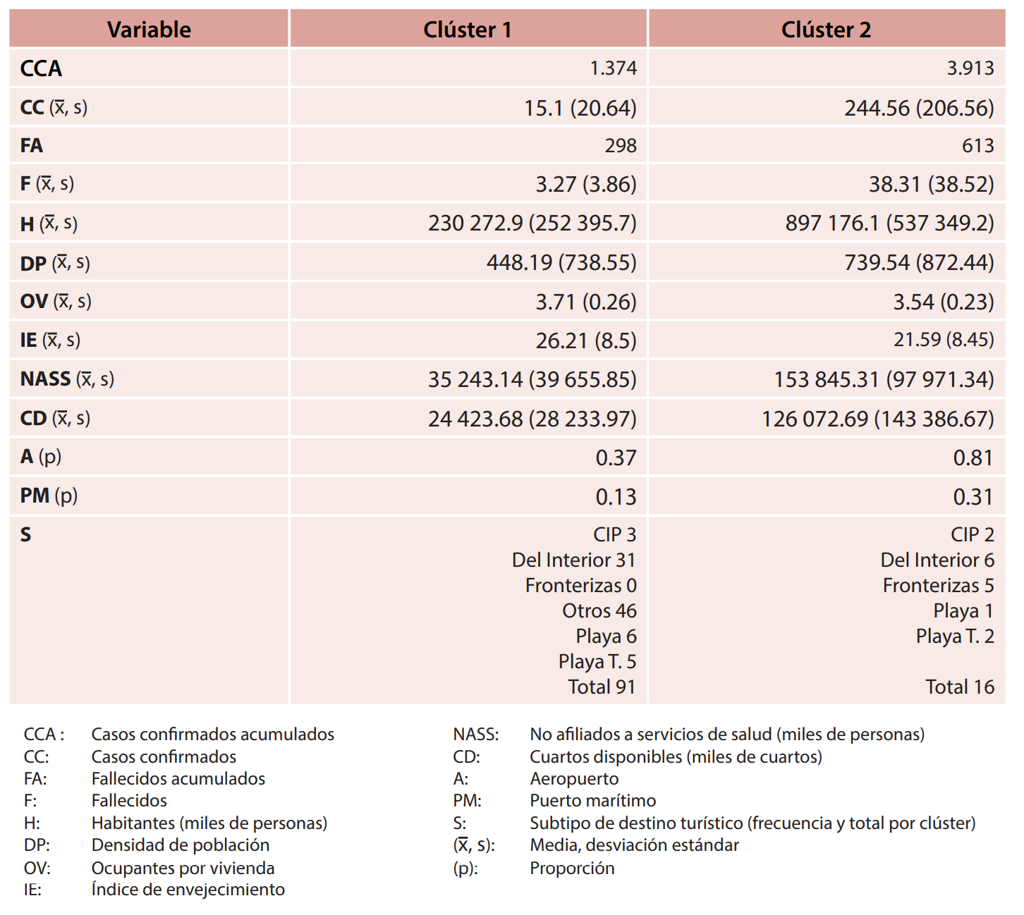 Tabla 1. Estadística descriptiva de los clústeres para el período previo a la fase 1 de la epidemia