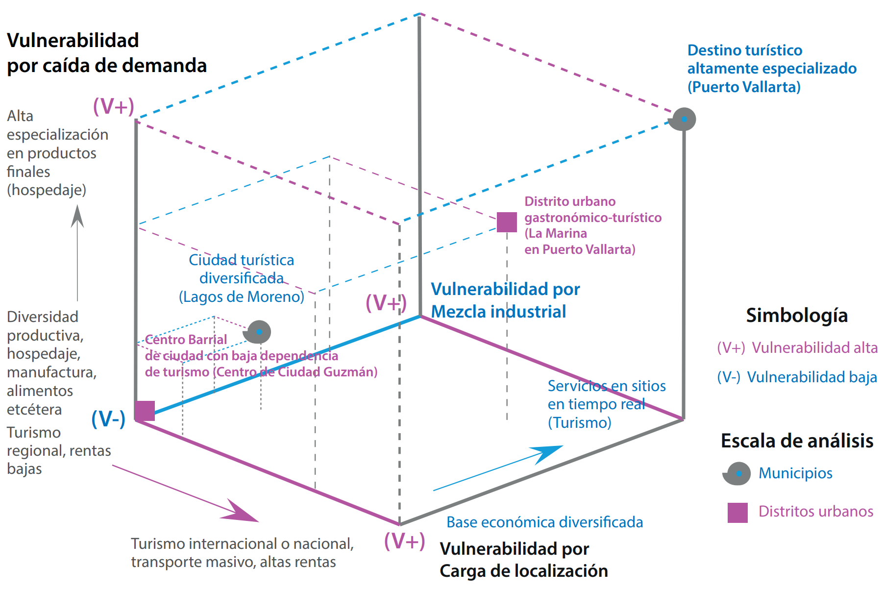 Resiliencia y vulnerabilidad se pueden estudiar a distinta escala, para múltiples fines y usando diferentes mediciones contextualmente relevantes. En este artículo se les estudia a nivel municipal, usando un concepto operacional de vulnerabilidad de economías locales que recupera tanto la noción, definida en términos de riesgos de afectación negativa derivada de un impacto o shock (Johnson, 2006; Briguglio et al., 2009; Batista et al., 2018), como los riesgos asociados a la dependencia del turismo, que dificultan la instrumentación de respuestas ante cambios estructurales acelerados (Pitarch-Garrido, 2020).