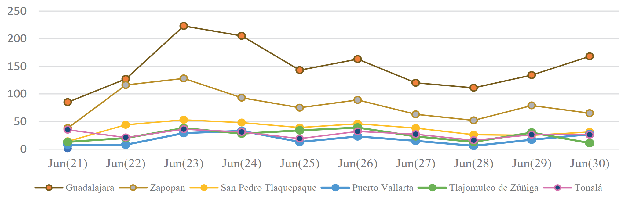 Las áreas metropolitanas en Guadalajara, Puerto Vallarta y, en menor medida, Ocotlán, son los que registraron el mayor número de casos en los primeros cuatro meses. La curva de contagios registró una tendencia creciente a partir del punto bajo del 10 de mayo, fecha en que se registraron tres casos en la metrópoli y solo uno en Guadalajara (SSJ, 2020). Desde entonces se alcanzaron máximos crecientes los días 13, 17 y 23 de junio, hasta llegar a los 553 casos en la zona, el día 6 de julio (ver gráfica 3).